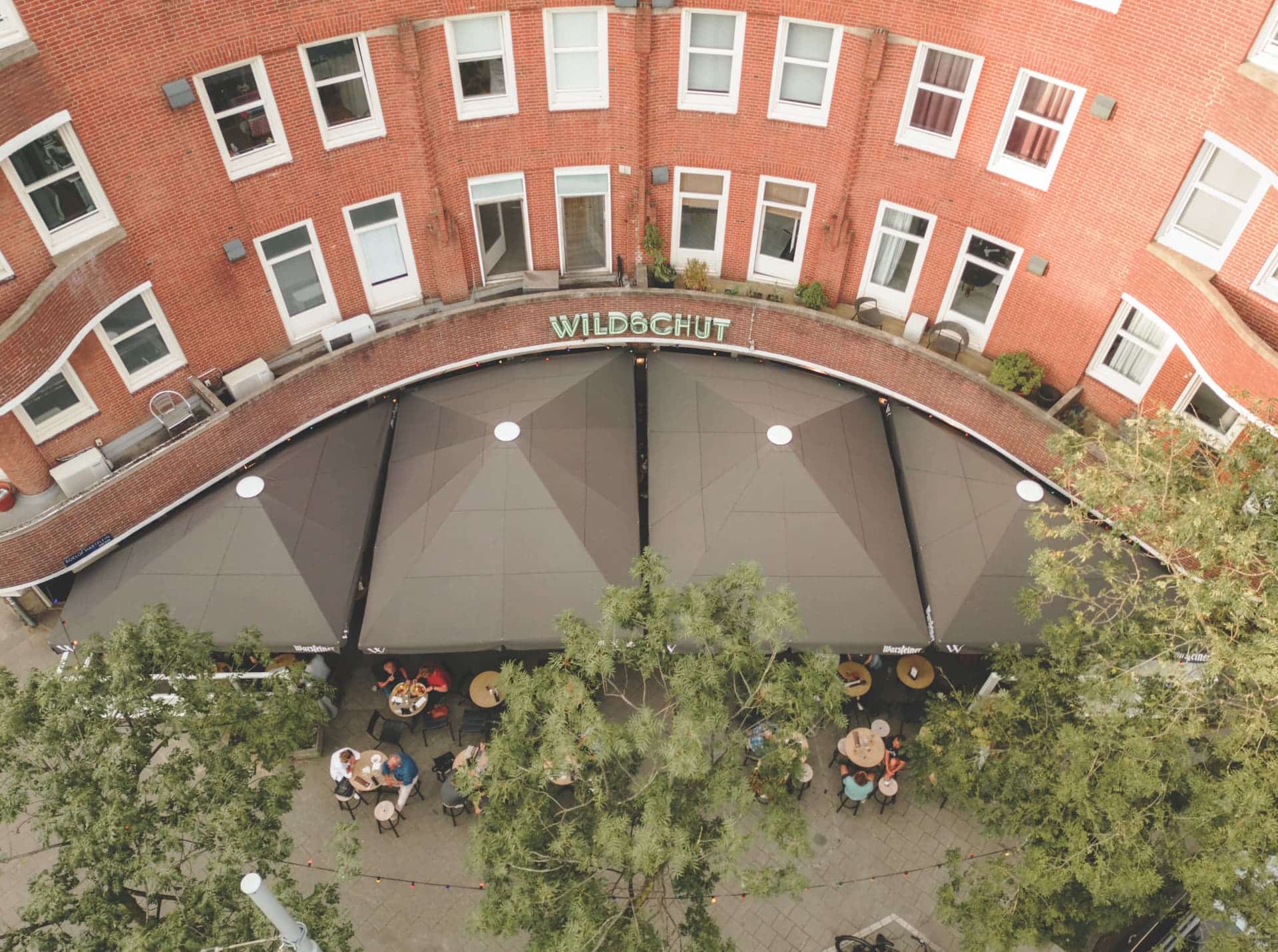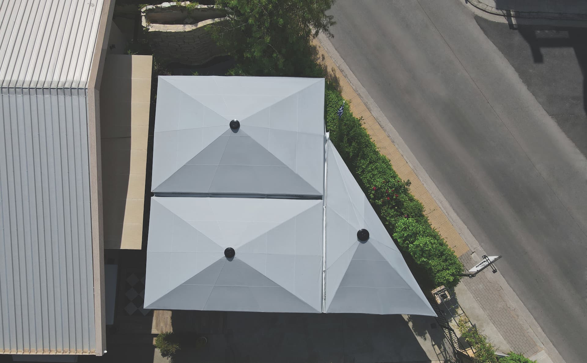 Στη συγκεκριμένη περίπτωση η ιδιόμορφη γεωμετρία του χώρου οδήγησε στην αναζήτηση λύσης για την κατασκευή ομπρελών ειδικών διαστάσεων. Μετά από επιμέτρηση του χώρου η γεωμετρία ήταν σχήματος ορθογώνιου τριγώνου με διαστάσεις (υποτείνουσα, προσκείμενη, απέναντι κάθετη) 17,2x13x11 m. Η ομάδα έρευνας της Remi σχεδίασε 3 ομπρέλες για την ολική κάλυψη του συγκεκριμένου χώρου. Οι ομπρέλες ειδικών διαστάσεων που σχεδιάστηκαν κατά παραγγελία ήταν μια παραλληλόγραμμη διαστάσεων (βάση, ύψος) 6,42×5,42 m και δύο σχήματος ορθογωνίου τριγώνου διαστάσεων (υποτείνουσα, προσκείμενη, απέναντι κάθετη) 6,42×5,42×8,4 m.